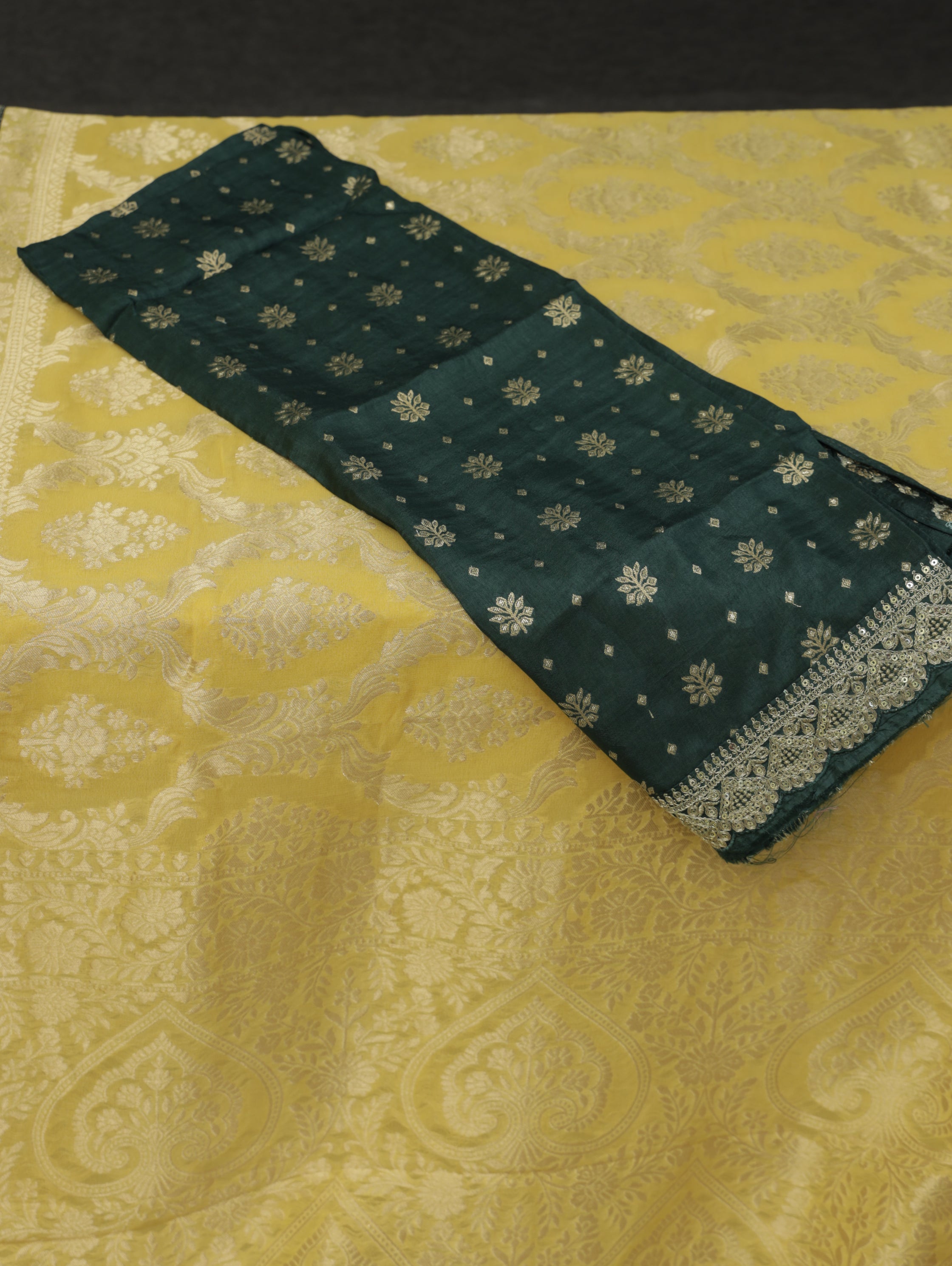 Golden Radiance in Banarasi Khaddi Georgette. Grace meets tradition in this exquisite Banarasi Khaddi Georgette saree, drenched in a soft golden yellow hue. Woven with intricate floral jaal patterns, the body shimmers with subtle zari detailing that exudes quiet luxury. The saree is beautifully bordered with a contrasting deep green scalloped lace enriched with delicate stone embellishments, adding a touch of festive charm.